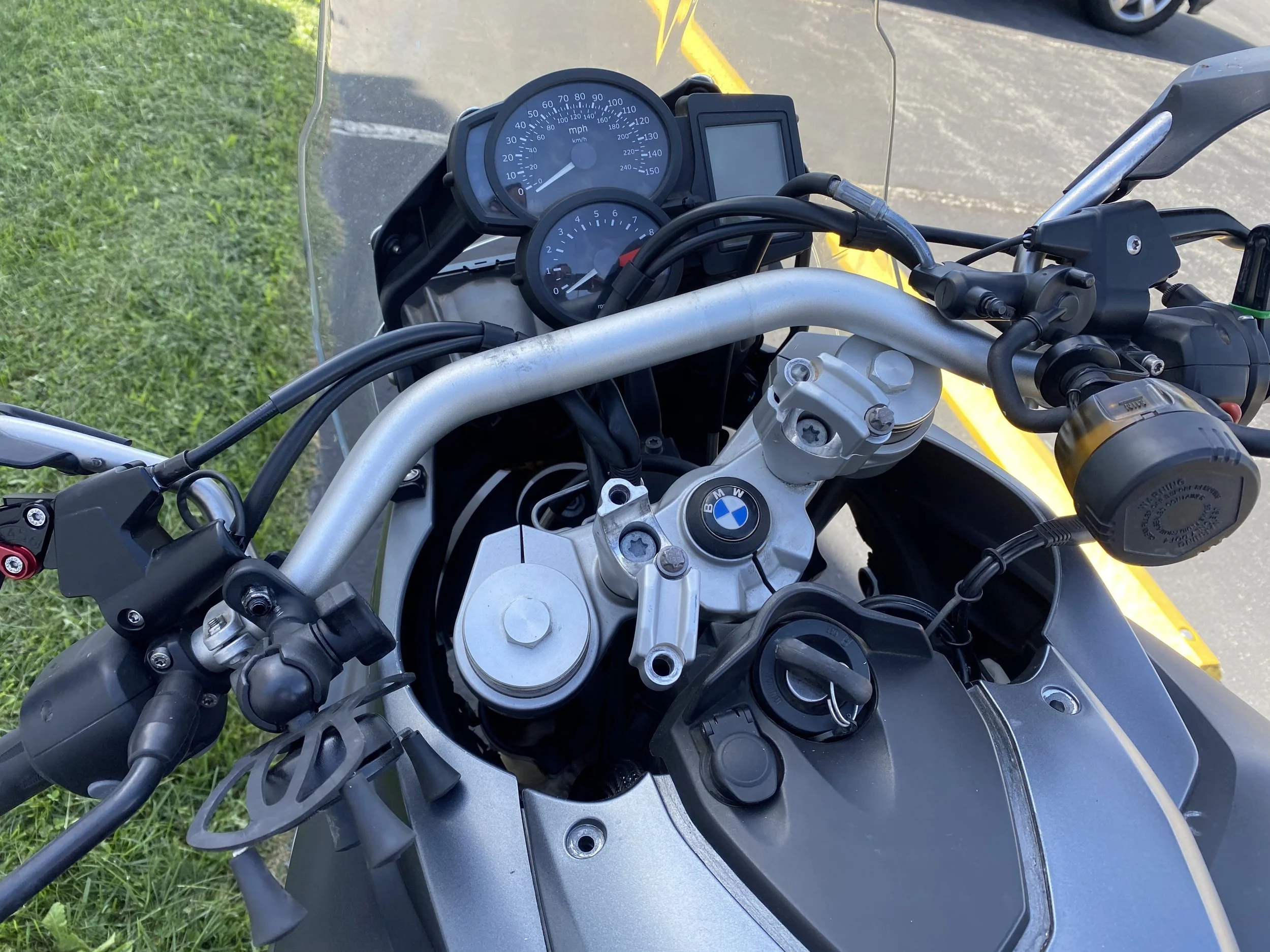 The next morning, I was loaded and ready to go, or so I thought… As I rode across the parking lot, there was something wrong with the steering. After investigating, I found that the bar risers were lose and had shifted after me gently dropping the bike. This is going to take a minute, so I found some shade because now it’s super-hot and humid out. I dig out my CruzTools and got to work. The bolts were very difficult to get to for me to ensure they got tightened down properly, so I removed the bar risers all together. After some time, I was back on the road.