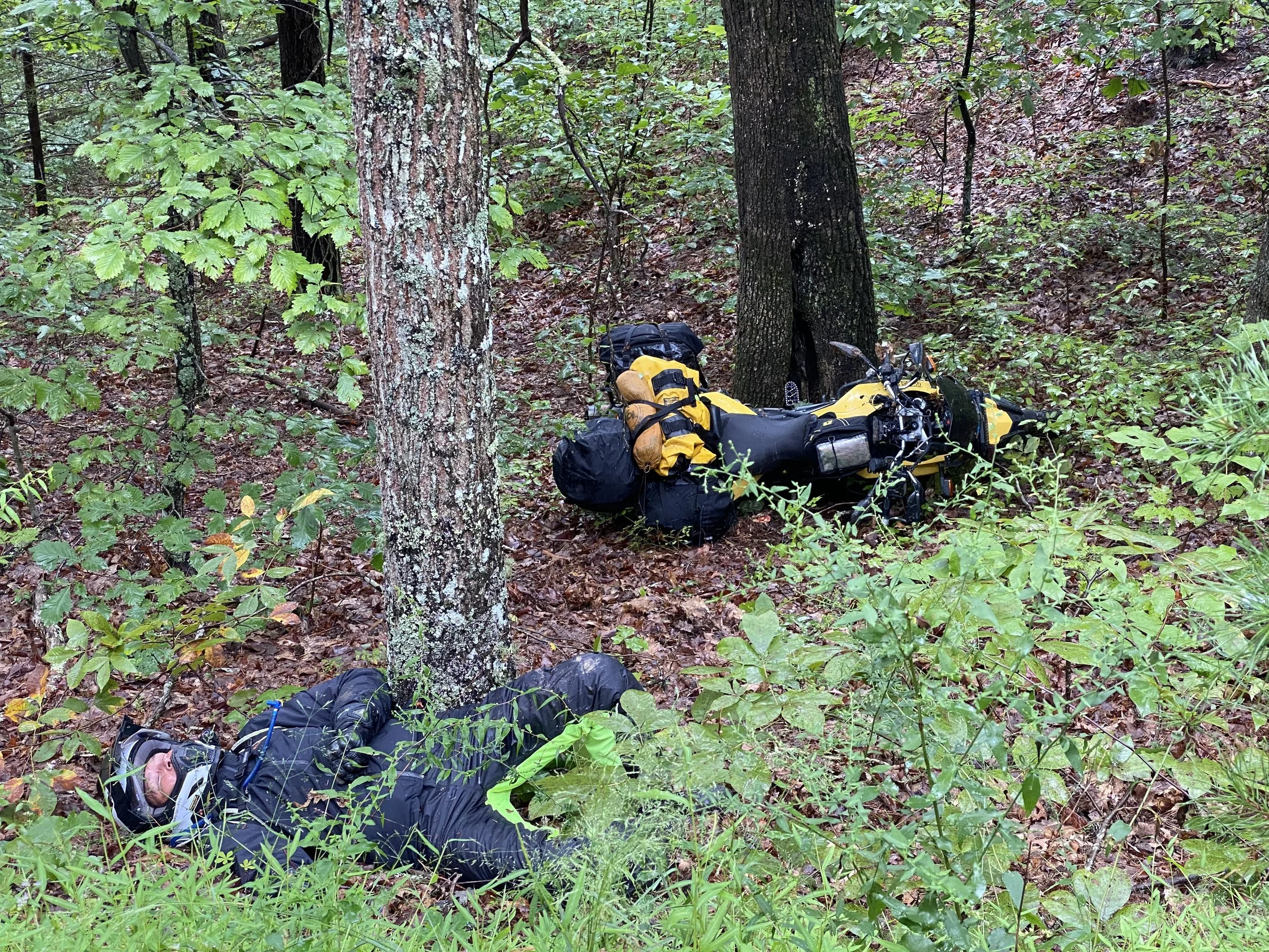 Let’s get into the reason for this blog post. A few days into being on the MABDR, I had to abandon the route due to heavy thunderstorms and took cover at my friend Marjorie’s place in Finksburg, MD. Marjorie was planning on joining me for 3-4 days, but due to the storms we were delayed a day. When it storms on the east coast, the skies open up and you better take cover because it does not mess around. It finally cleared up and we set out on the route. The second day on the route, the rains came back and at some point, we stopped for lunch, and we made the discussion to find a hotel and hunker down for the remaining of the day. We had about 30 miles to ride where we could do just that. Back on route, we were having a ball. We stopped to checked in with each other and we were both good with the rainy conditions and because we were having so much fun, we decided to continue the route. That decision proved to be a bad one. Roughly 30 miles from Brandywine, WV, I hit a snotty patch and off the road I went! And just like that, with the bat of an eye, I was on my back leaning against a tree after taking flight like Wonder Woman and landing headfirst into the “softish” bank. Max, my BMW GS flipped flopped her way like a gymnast and come to rest next to a tree as well. I just laid there assessing what I was feeling and saw that Marjorie had gotten stopped and was heading my way. I yelled out, “Stop, I’m ok, but we need to get this on camera.” Lol. So, she went back and captured the scene. Yes, that is how I roll. Now, I feel you all can learn from another hard, expensive lesson of mine. Thankfully, I was uninjured, but Max was another story.